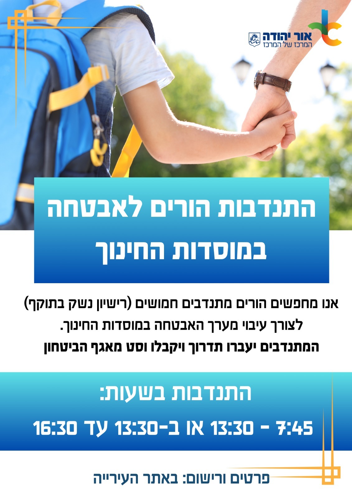 אנו מחפשים מתנדבים חמושים (רישיון נשק בתוקף) לצורך עיבוי מערך האבטחה במוסדות החינוך. המתנדבים יעברו תדרוך ויקבלו וסט מאגף הביטחון