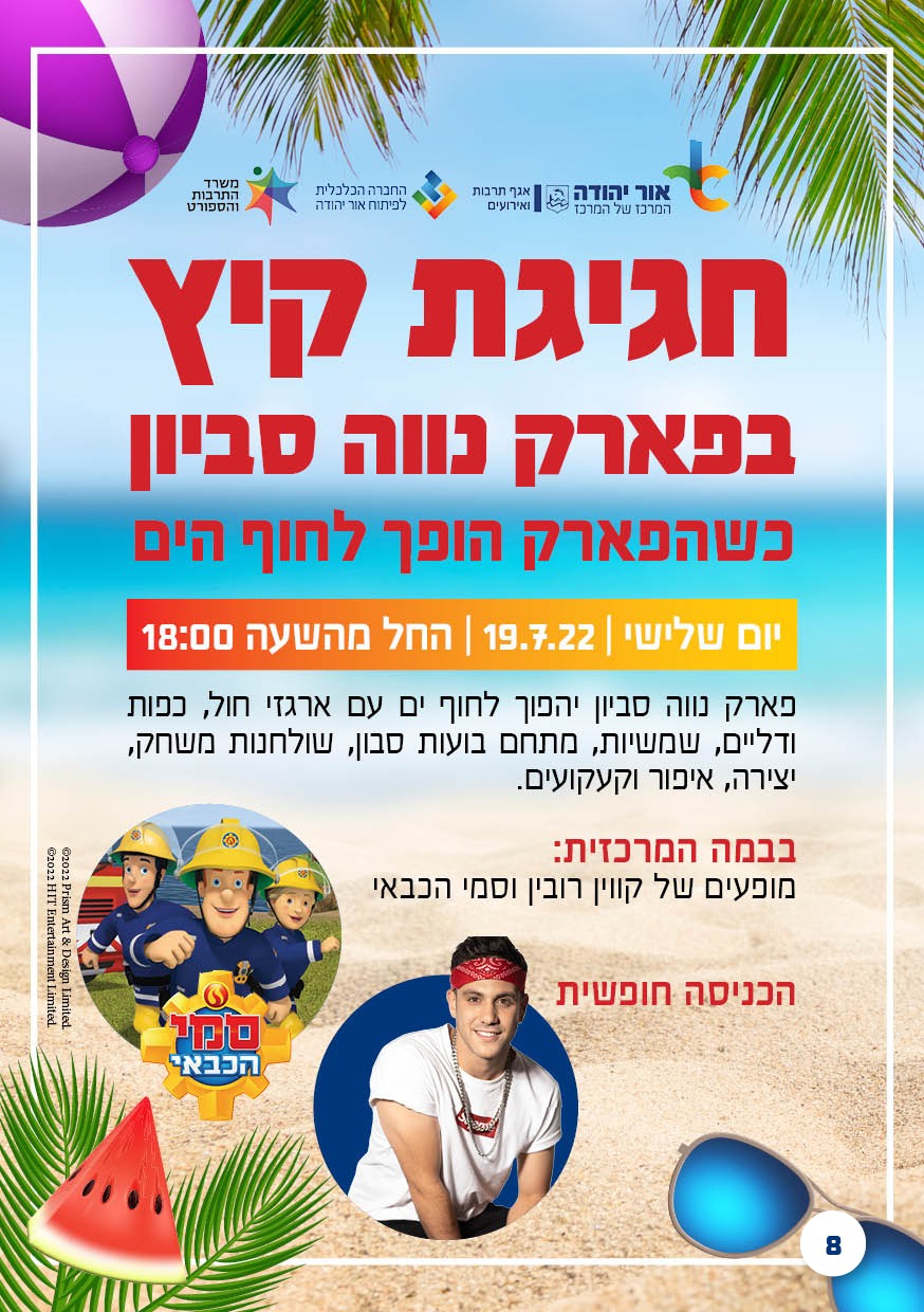 פארק נווה סביון יהפוך לחוף ים עם ארגזי חול, כפות ודליים, שמשיות, מתחם בועות סבון, שולחנות משחק, יצירה, איפור וקעקועים.