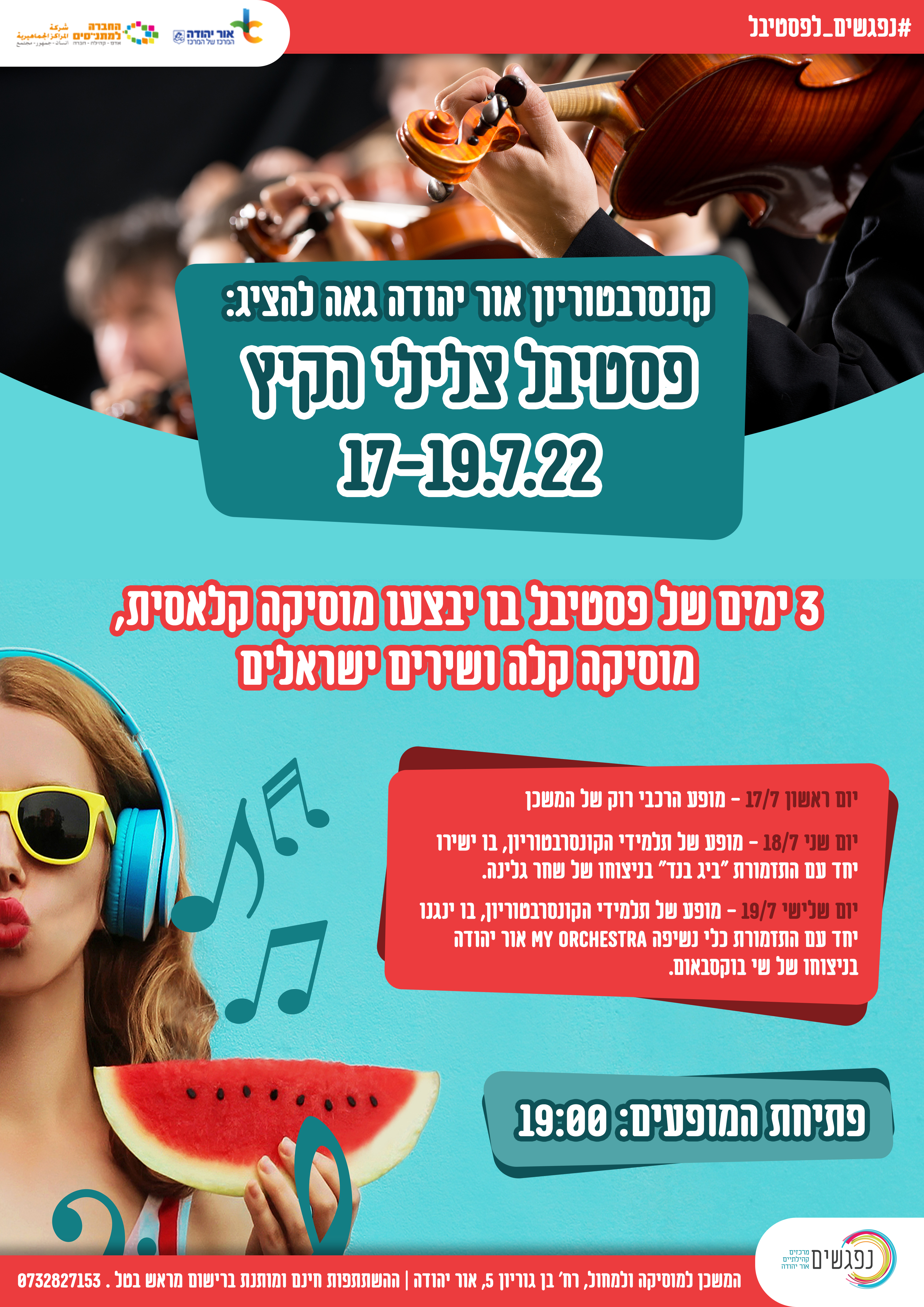 * יום שלישי, 19.7 - מופע של תלמידי הקונסרבטוריון בו ינגנו יחד עם התזמורת כלי נשיפה my orchestra אור יהודה בניצוחו של שי בוקסבאום