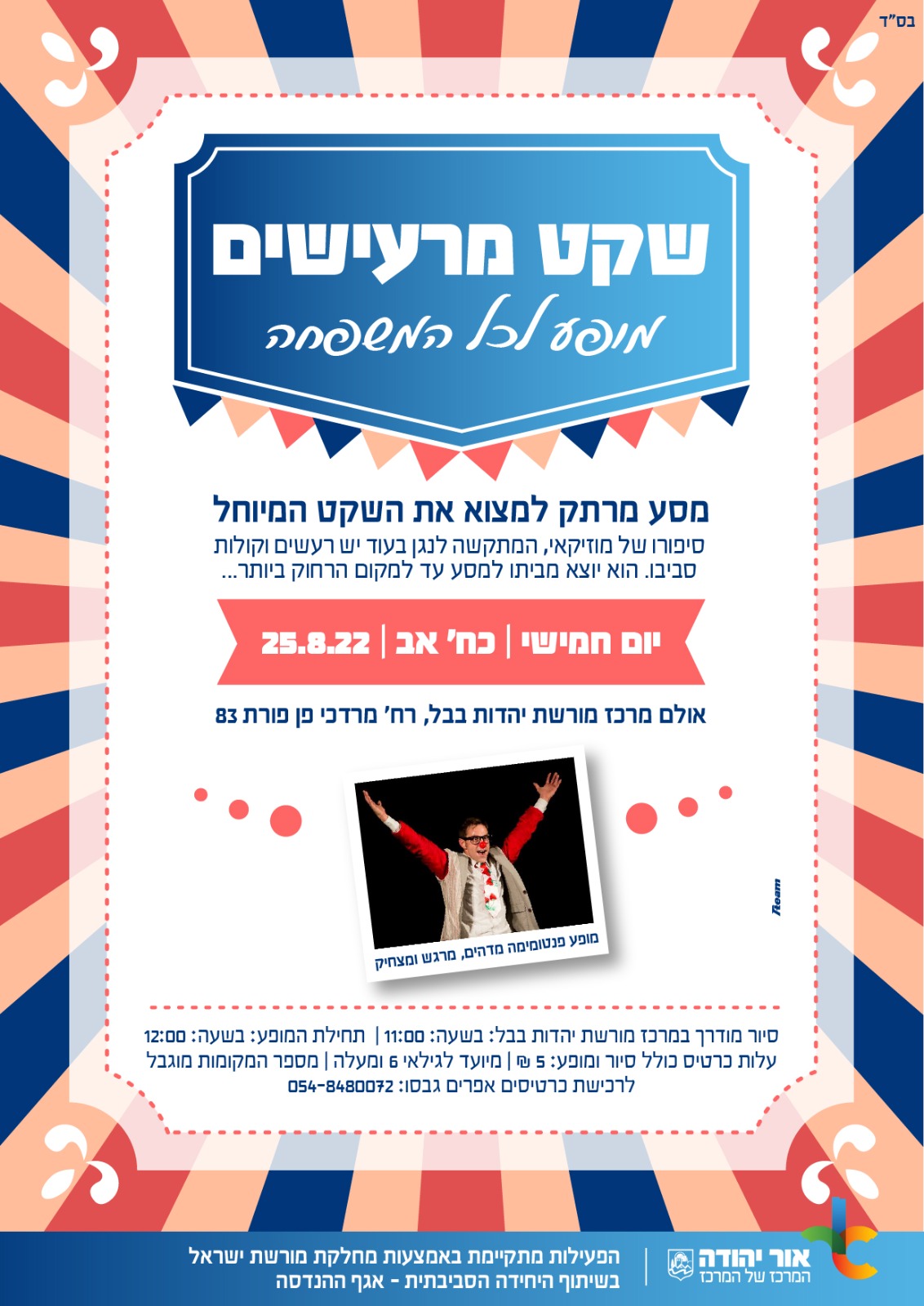 סיור מודרך במרכז מורשת יהדות בבל: בשעה 11:00. תחילת המוםע: בשעה 12:00. עלות כרטיס כולל סיור ומופע: 5 ש"ח. מיועד לגילאי 6 ומעלה. מספר המקומות מוגבל. לרכישת כרטיסים - אפרים גבסו 054-8480072