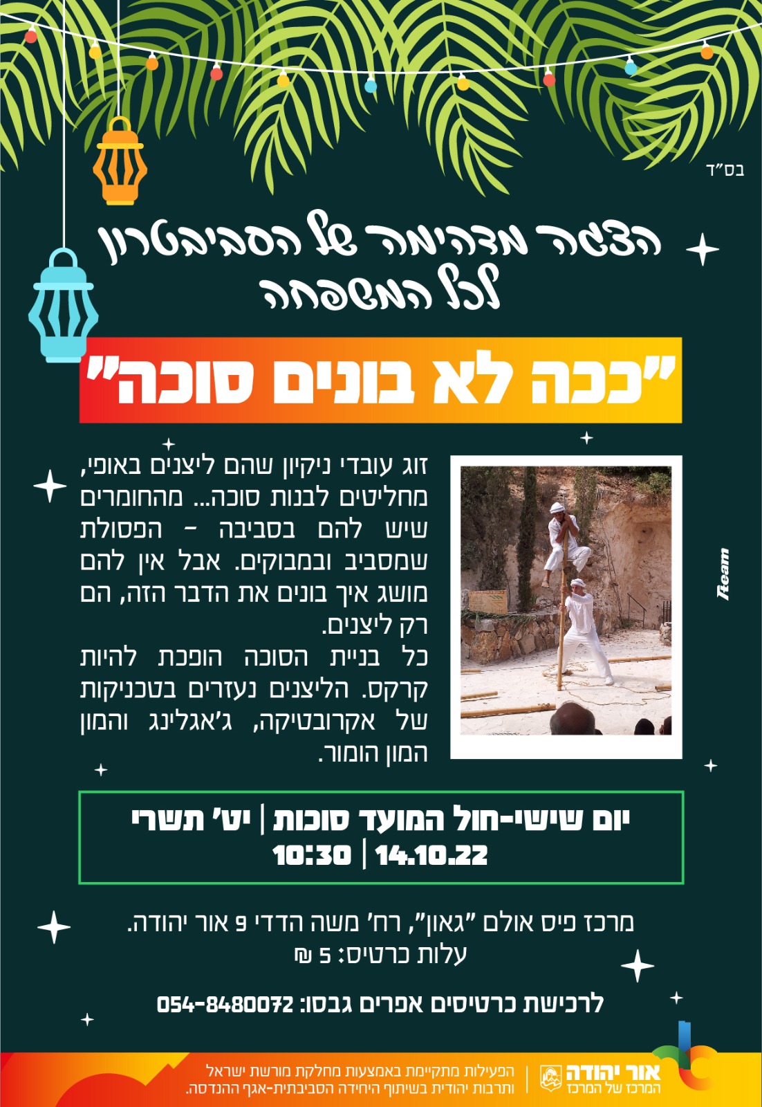 יום שישי-חול המועד סוכות, י"ט תשרי, 14.10.22, 10:30, מרכז פיס אולם "גאון", רח' משה הדדי 9, אור יהודה. עלות כרטיס: 5 ש"ח. לרכישת כרטיסים אפרים גבסו - 054-8480072