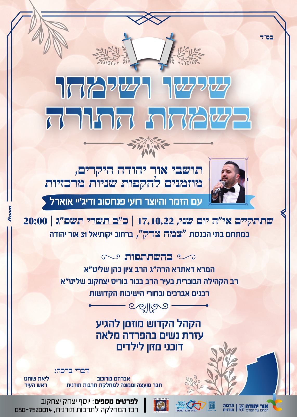 תושבי אור יהודה היקרים מוזמנים להקפות שניות מרכזיות
