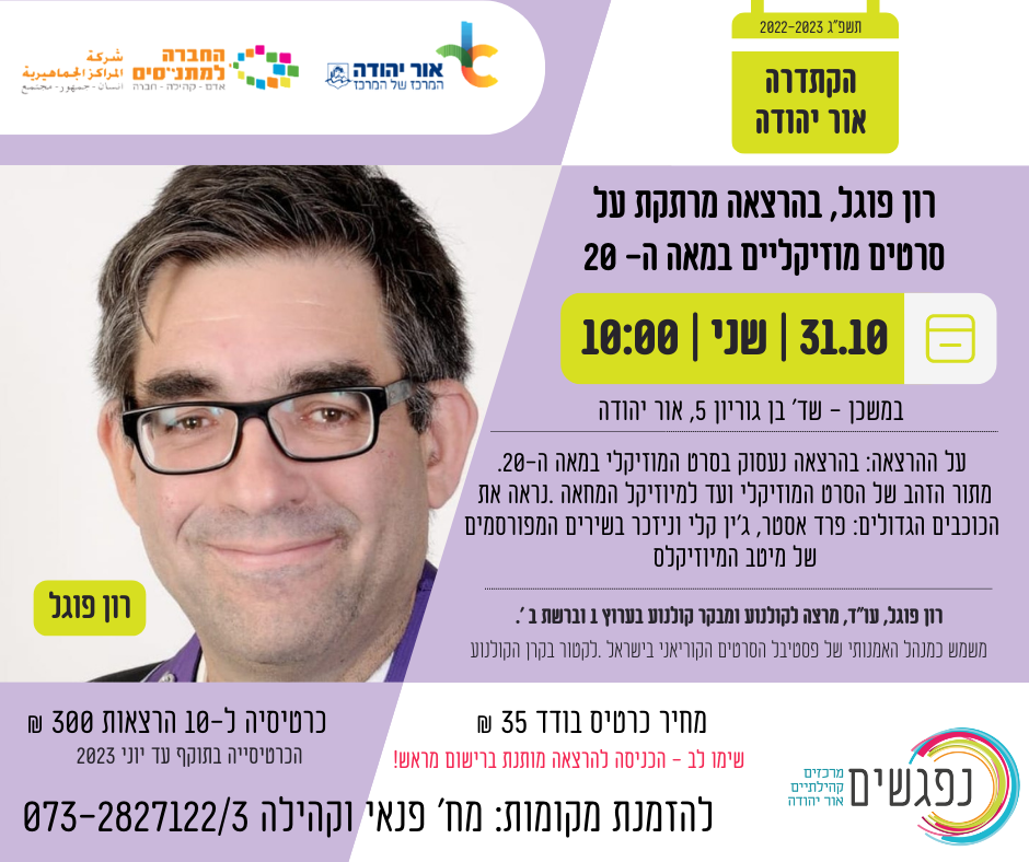 על ההרצאה: בהרצאה נעסוק בסרט המוסיקלי במאה ה-20. מתור הזהב של הסרט המוסיקלי ועד למיוזיקל המחאה. נראה את הכוכבים הגדולים: פרד אסטר, ג'ין קלי, וניזכר בשירים המפורסמים של מיטב המיוזיקלס