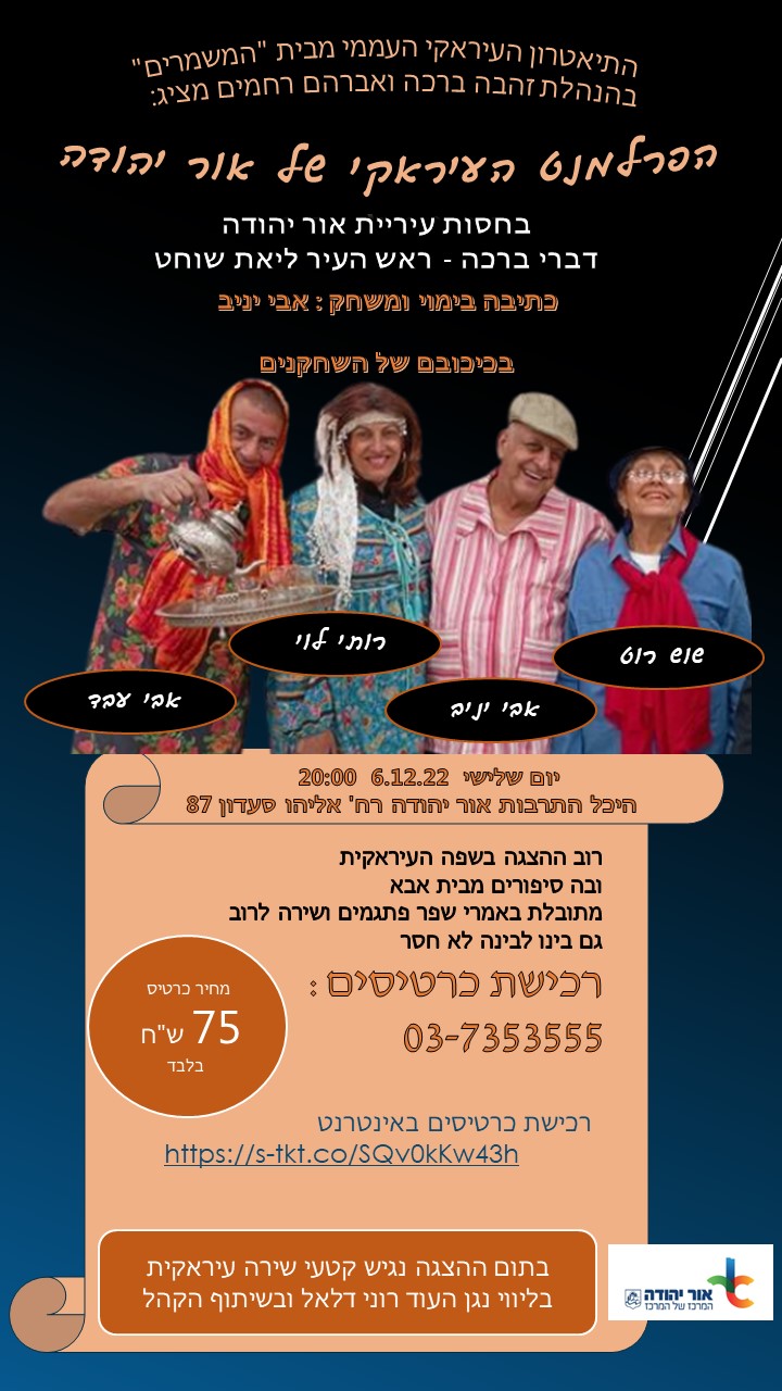 התיאטרון העיראקי העממי מבית "המשמרים" בהנהלת זהבה ברכה ואברהם רחמים מציג: