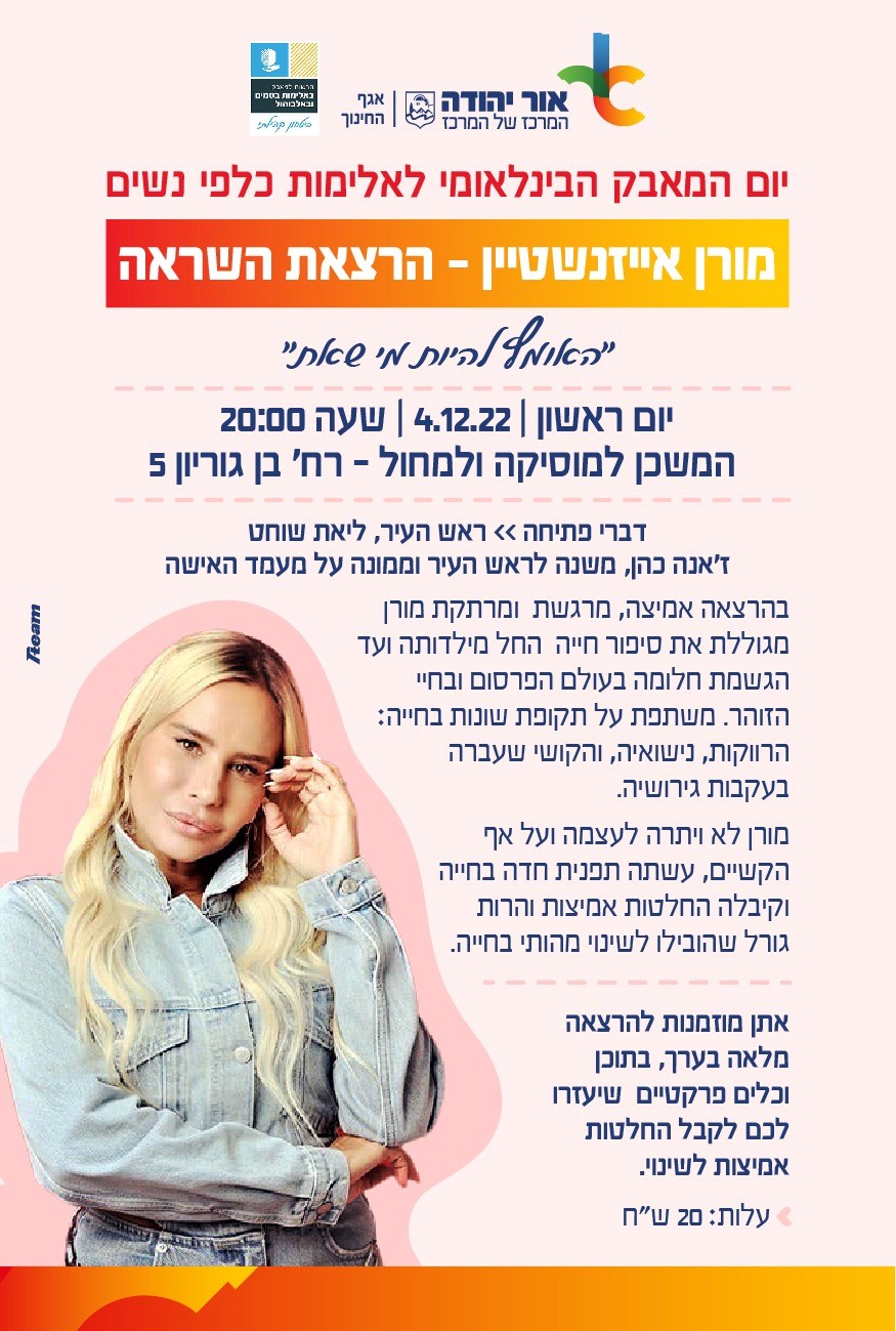אתן מוזמנות להרצאתה האמיצה, המרגשת והמרתקת של מורן, שתיתן לכן גם כלים פרקטיים שיעזרו לכן לקבל החלטות אמיצות לשינוי, כל זאת לרגל ציון יום המאבק באלימות נגד נשים.