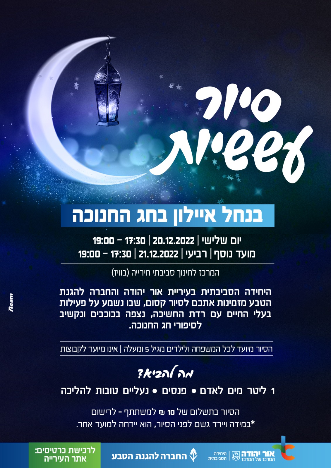 היחידה הסביבתית בעיריית אור יהודה והחברה להגנת הטבע מזמינות אתכם לטיול קסום שבו נשמע על פעילות בעלי החיים עם רדת החשיכה, נצפה בכוכבים ונקשיב לסיפורי חג החנוכה.