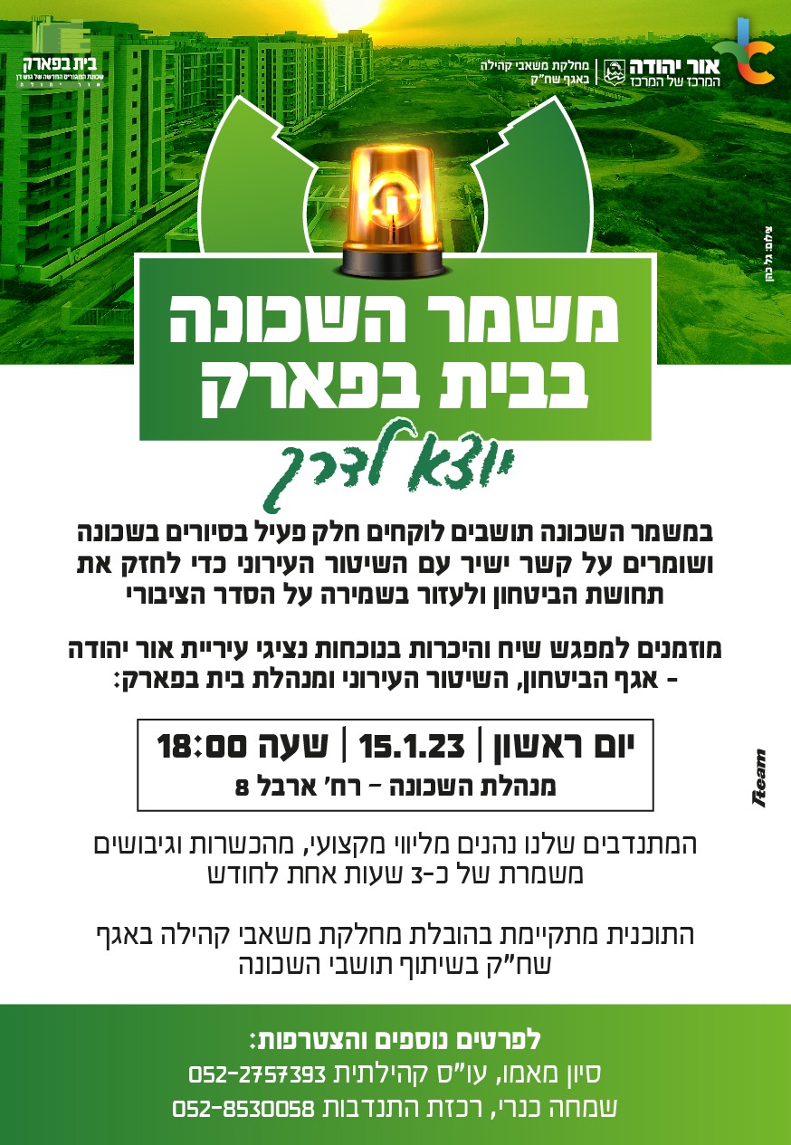 מוזמנים למפגש שיח והיכרות בנוכחות נציגי עיריית אור יהודה - אגף הביטחון, השיטור העירוני ומנהלת בית בפארק.