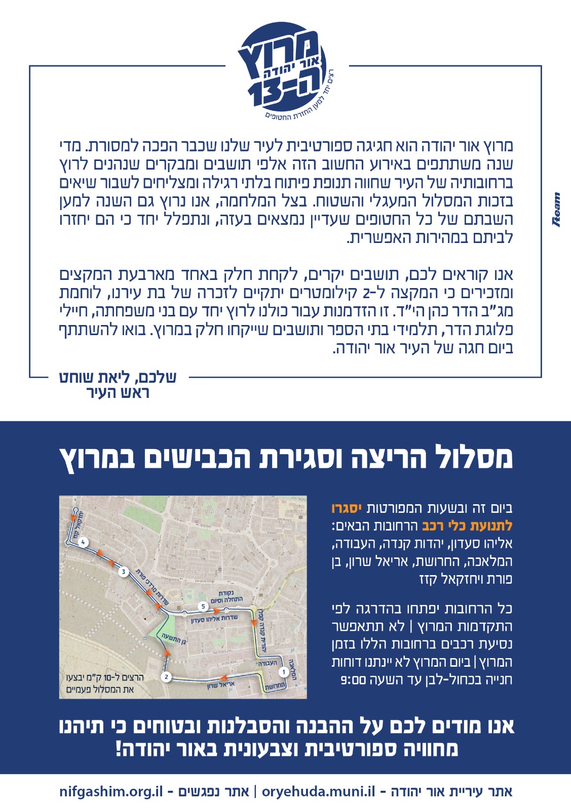 אנו מודים לכם על ההבנה והסבלנות ובטוחים כי תיהנו מחוויה ספורטיבית וצבעונית באור יהודה!