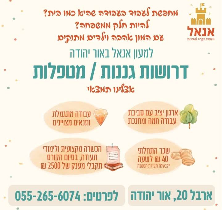 למעון אנאל באור יהודה דרושות גננות/מטפלות