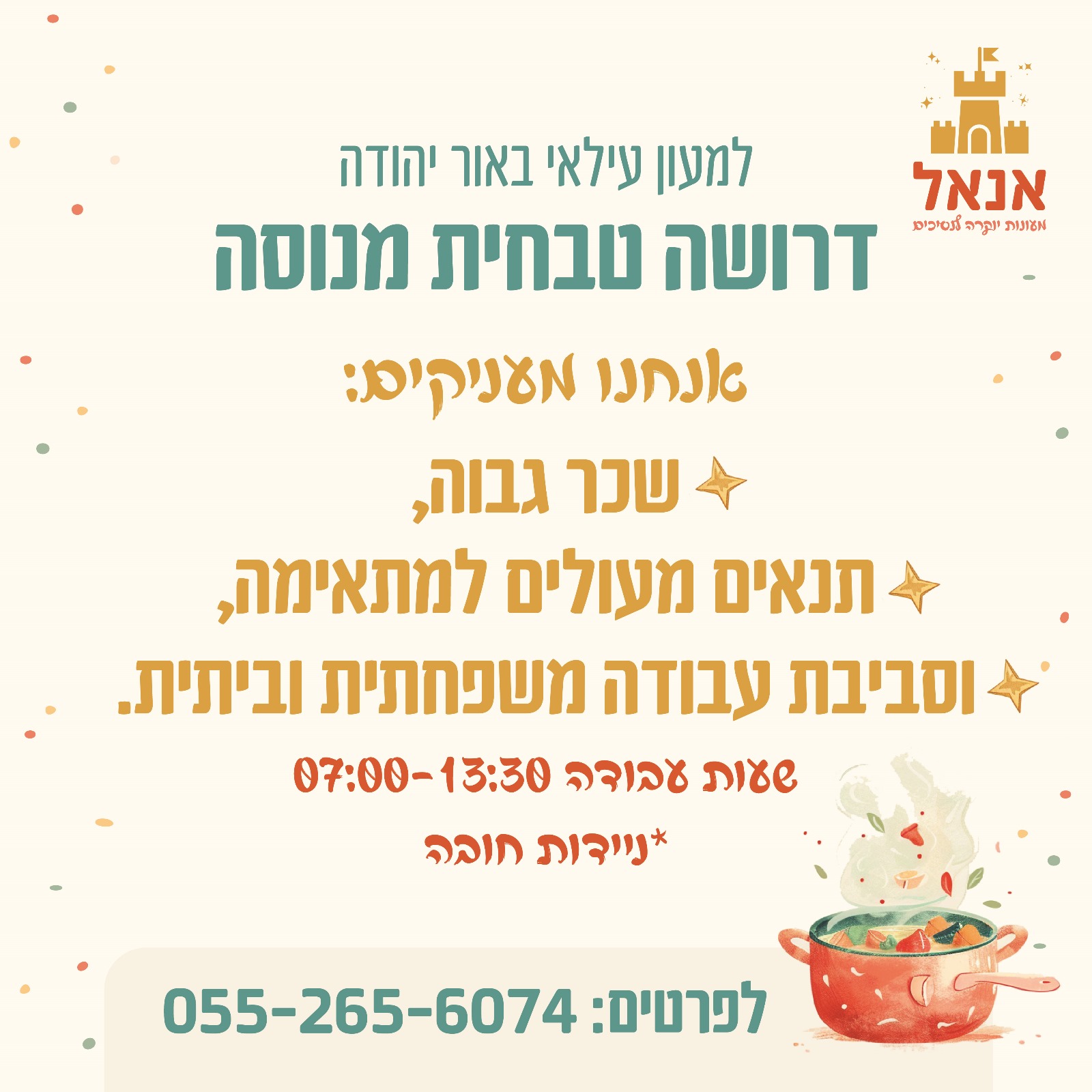 למעון עילאי באור יהודה דרושה טבחית מנוסה