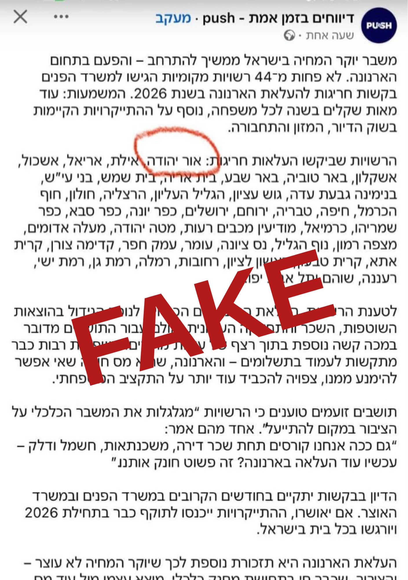 ביממה האחרונה פורסמה ידיעה ב"ישראל היום" ידיעה לפיה רשויות מקומיות, ביניהן עיריית אור יהודה ביקשו העלאה חריגה בארנונה לשנת 2026. והאמת? בדיוק הפוך.