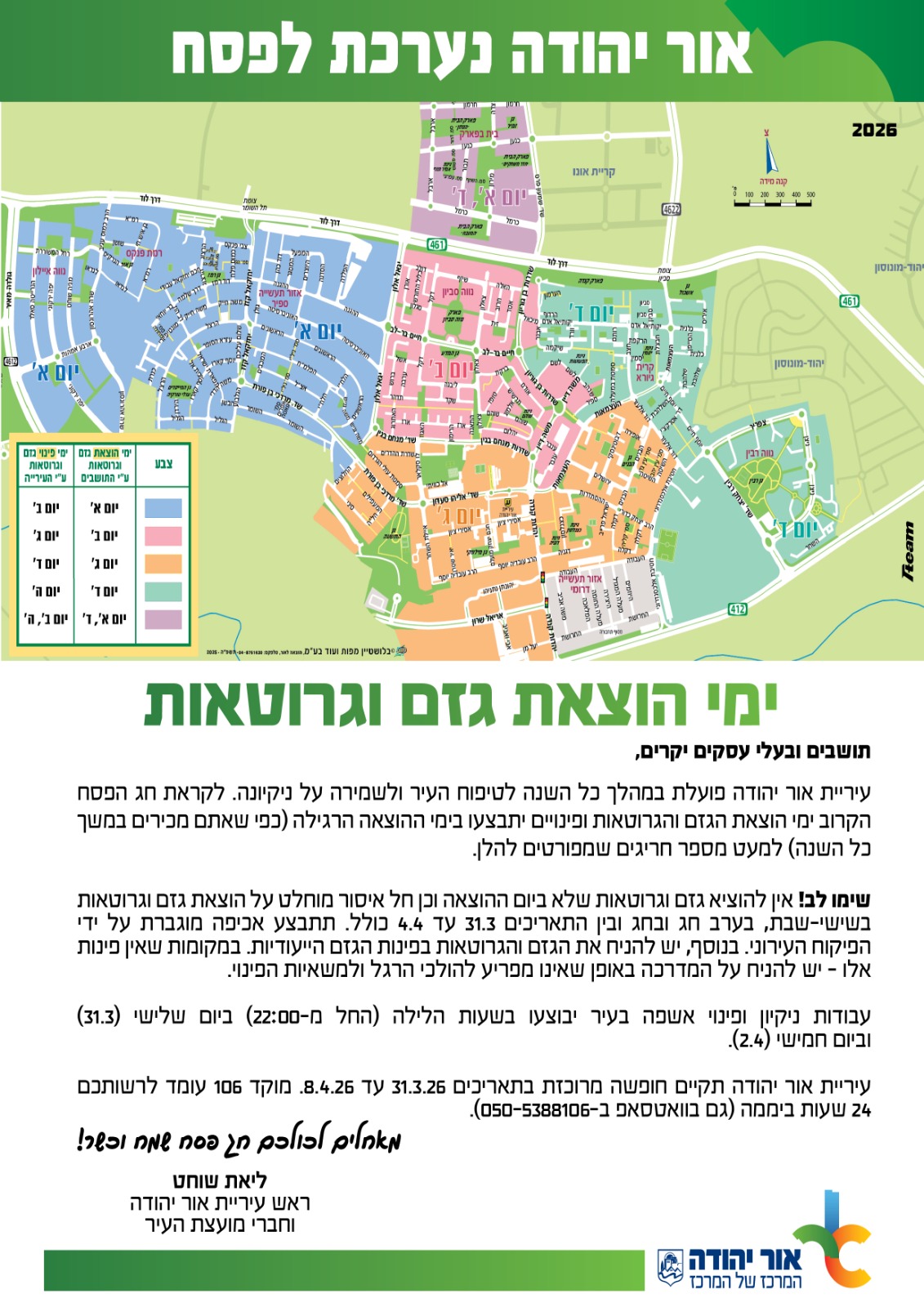עיריית אור יהודה פועלת במהלך כל השנה לטיפוח העיר ולשמירה על ניקיונה. לקראת חג פסח הקרוב ימי הוצאת הגזם והגרוטאות ופינויים יתבצעו בימי ההוצאה הרגילה (כפי שאתם מכירים במשך כל השנה) למעט מספר חריגים שמפורטים להלן.