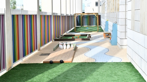 המתחם שכולל מגוון משחקי חצר לפעילות מהנה בזמן ההפסקות ולחיזוק הקשרים החברתיים מיועד לתלמידי כיתות א' ו-ב' וממוקם בהרחבה של שטח בית הספר
