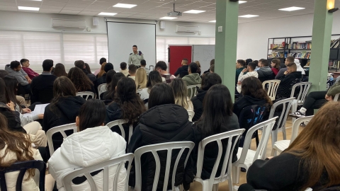 תלמידי כיתות י"ב בתיכון יובלים באור יהודה קיימו מפגש עם סגן רותם עג'אם, מ"פ בסיירת גבעתי, תושב העיר ובוגר בית הספר, במסגרת מיזם של צה"ל ומשרד החינוך