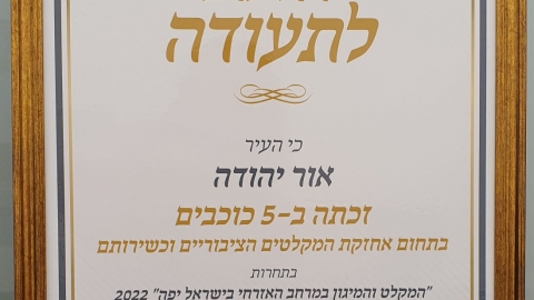 בטקס שנערך במכללה לאיתנות ישראלית של פיקוד העורף קיבלה עיריית אור יהודה אות הוקרה מיוחד על תחזוקת המקלטים הציבוריים וכשירותם לשעת חירום