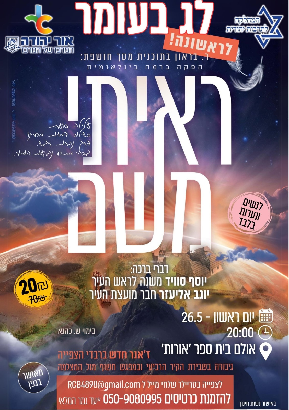 יום ראשון, 26.5, 20:00, אולם בית ספר אורות.