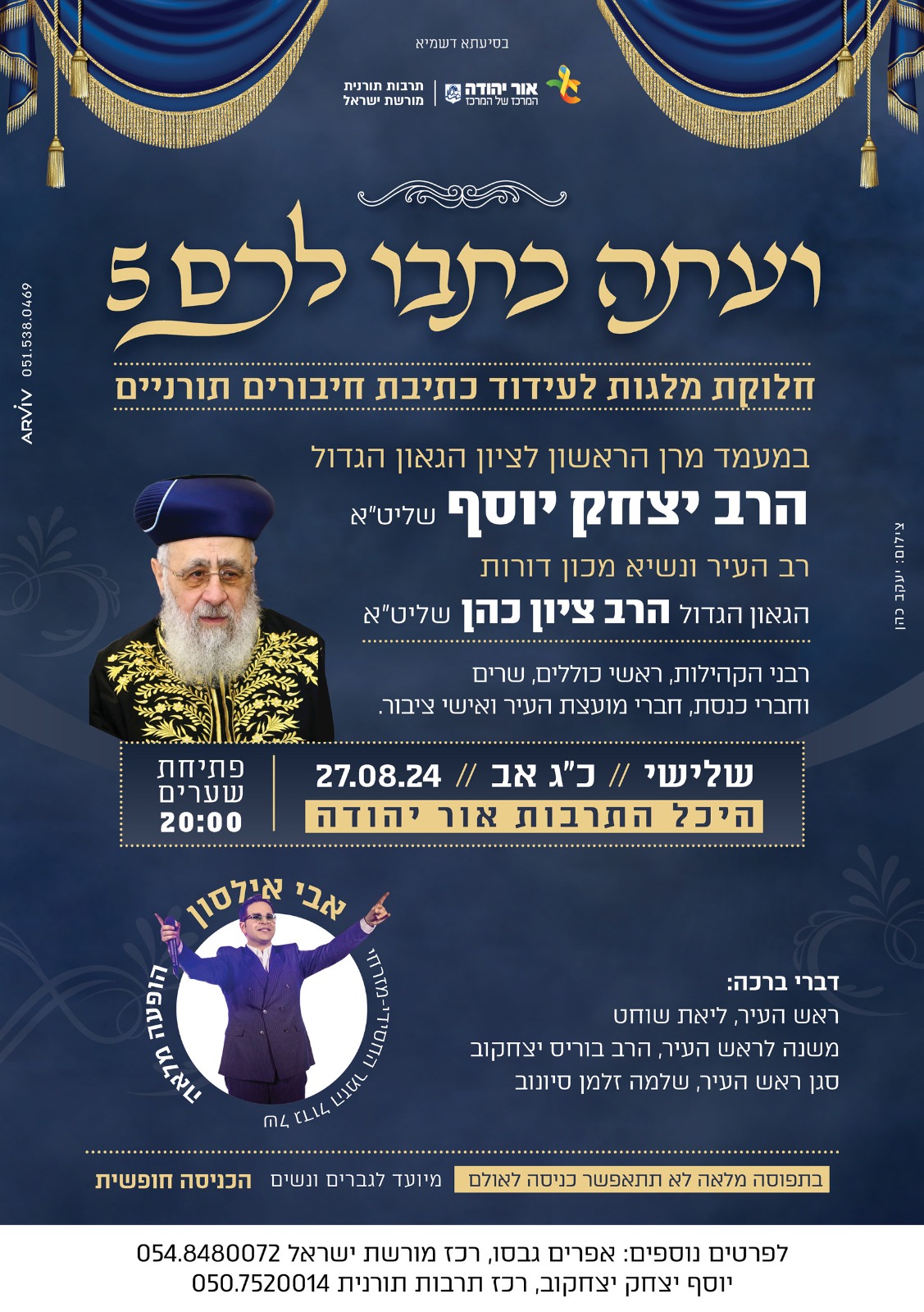 לפרטים נוספים: אפרים גבסו, רכז מורשת ישראל 054-8480072, יוסף יצחק יצחקוב, רכז תרבות תורנית - 050-7520014