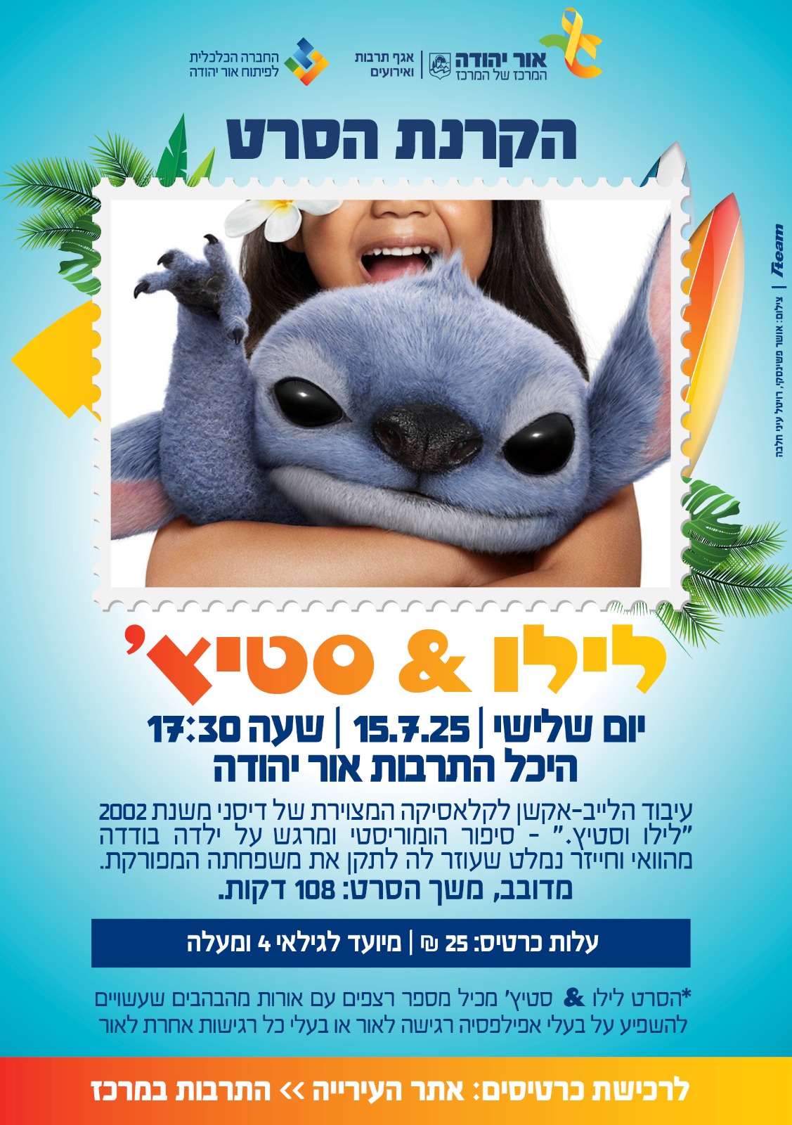 עיבוד הלייב-אקשן לקלאסיקה המצוירת של דיסני משנת 2002 "לילו וסטיץ'" - סיפור הומוריסטי ומרגש על ילדה בודדה מהוואי וחייזר נמלט שעוזר לה לתקן את משפחתה המפורקת. מדובב, משך הסרט: 108 דקות.