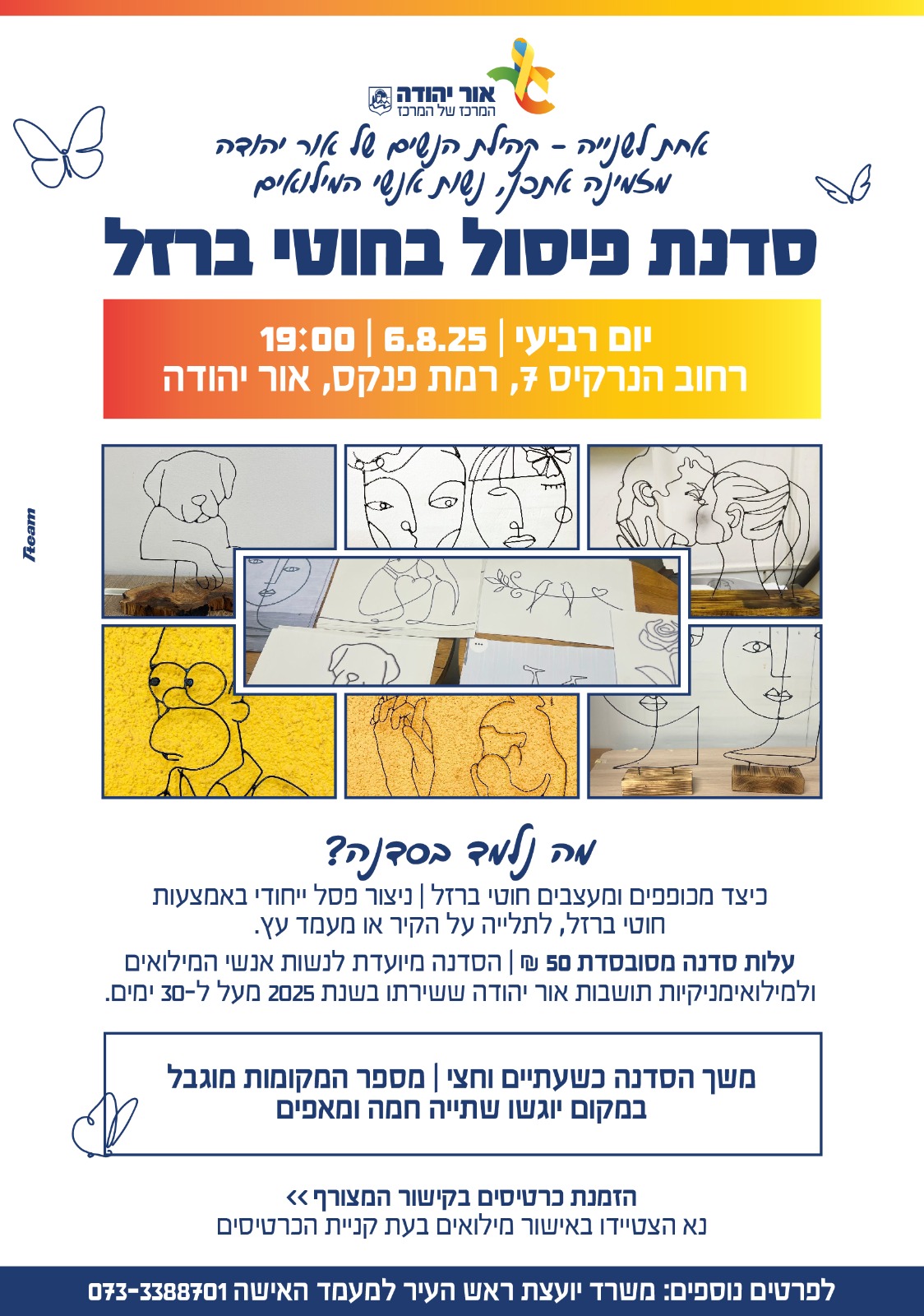 עלות סדנה מסובסדת: 50 ש"ח. הסדנה מיועדת לנשות אנשי המילואים ולמילואימניקיות תושבות אור יהודה ששירתו בשנת 2025 מעל ל-30 ימים.