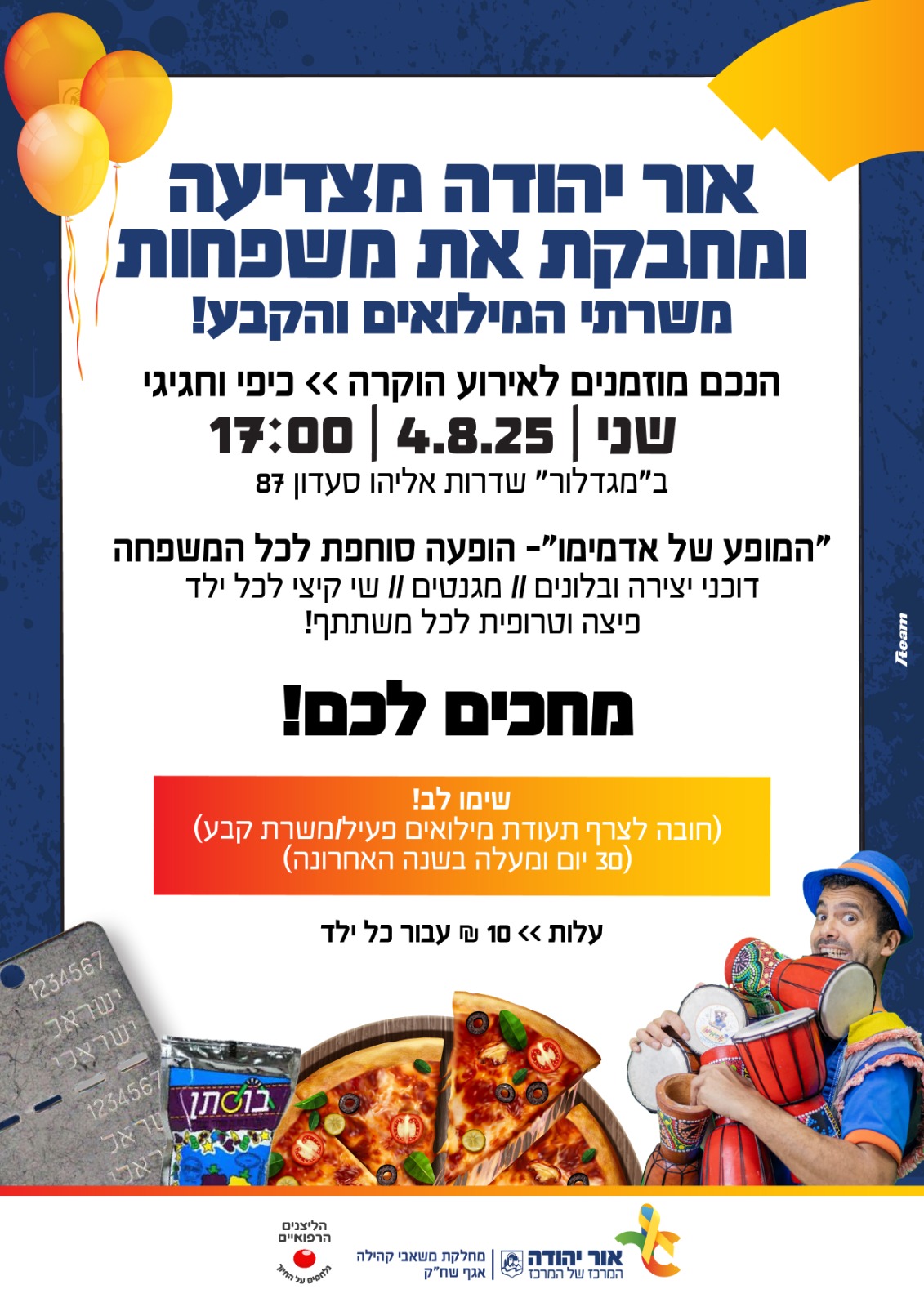 "המופע של אדמימו" - הופעה סוחפת לכל המשפחה. דוכני יצירה ובלונים, מגנטים, שי קיצי לכל ילד, פיצה וטרופית לכל משתתף.