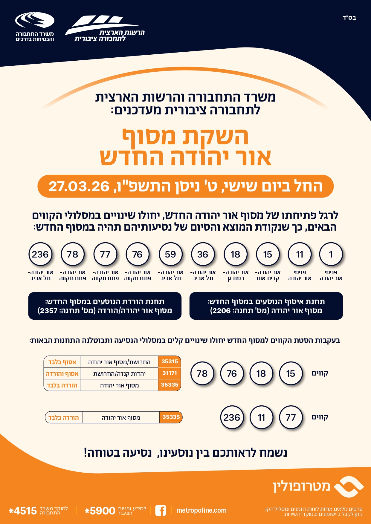 פרטים מלאים אודות לוחות הזמנים ומסלול הקו ניתן לקבל ביישומונים ובמוקדי השירות של מטרופולין. למידע ופניות הציבור 5900*, למוקד משרד התחבורה 4515*, אתר מטרופולין metropoline.com