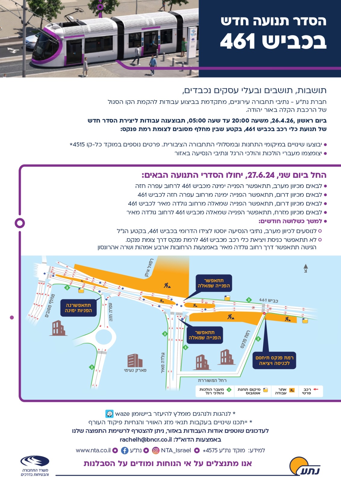 הסדר תנועה חדש החל מהשבוע הבא בכביש 461 - רחובות עופרה חזה וגולדה מאיר (בנווה איילון) נפתחים לתנועה מלאה, הכניסה הראשית לרמת פנקס תיחסם זמנית לכ-3 חודשים ותתאפשר כניסה דרך נווה איילון